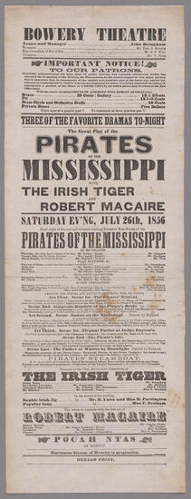 Wednesday evening, July 23, 1856, third night of the new and intensely exciting romantic melodrama of "The Pirates of the Mississippi"