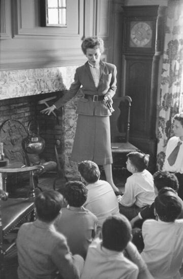NYC - Fifth Avenue [Metropolitan Museum of Art staff member Katherine Richardson with school children in the American Wing.]