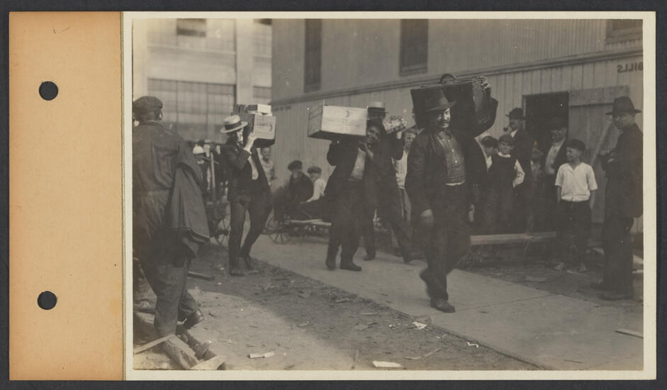 EMPLOYEES ASSOCIATION OF MORSE DRY DOCK AND REPAIR CO. [MEN CARRYING BOXES WHILE MEN AND BOYS WATCH.]