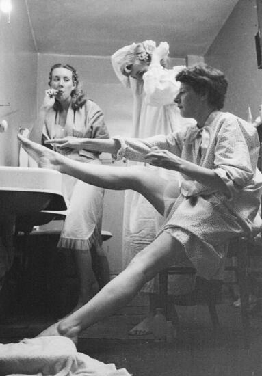 Photographs taken at the Rehearsal Club, a boarding house for young women pursuing a career in theater. Depicts residents standing on the front steps of the brownstone building located on West 53rd Street; posing for individual portraits; spending time in their shared bedrooms; and working at their jobs in nightclubs, dance studios, and theaters.