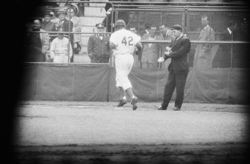 Photographs of Duke Snyder and other players for the Brooklyn Dodgers playing a baseball game in a mostly empty stadium.