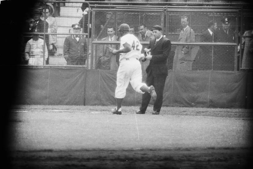 Photographs of Duke Snyder and other players for the Brooklyn Dodgers playing a baseball game in a mostly empty stadium.