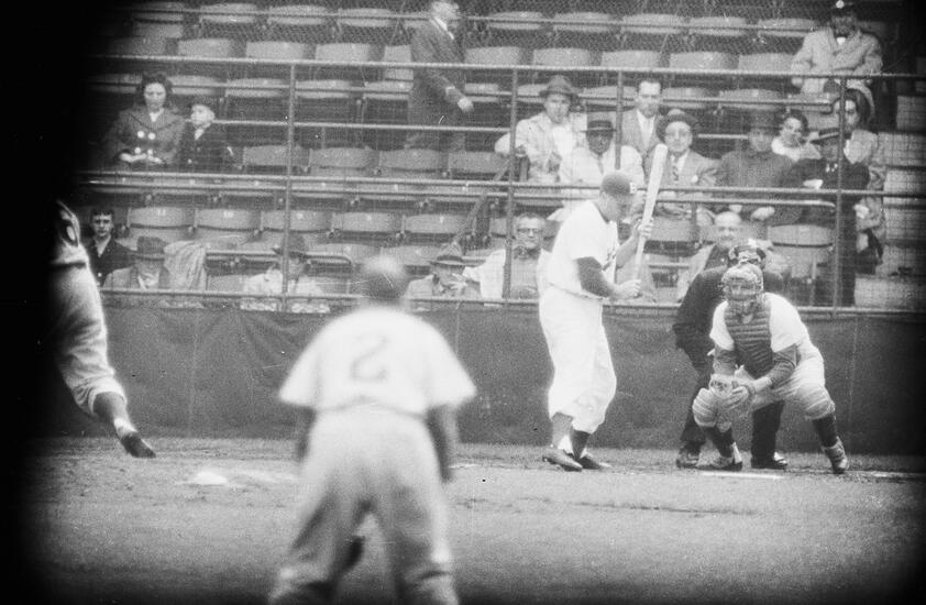 Photographs of Duke Snyder and other players for the Brooklyn Dodgers playing a baseball game in a mostly empty stadium.