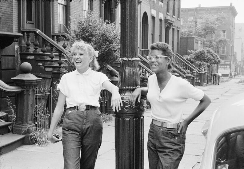 Photographs of people and places in Brooklyn associated with the four teenage boys known as the Brooklyn Thrill Killers. Depicts a grocer, a women working at a soda shop, a dry cleaner, a couple on a bench, a man on the beach under the Manhattan Bridge, a woman in an apartment, and teenagers walking down a street.