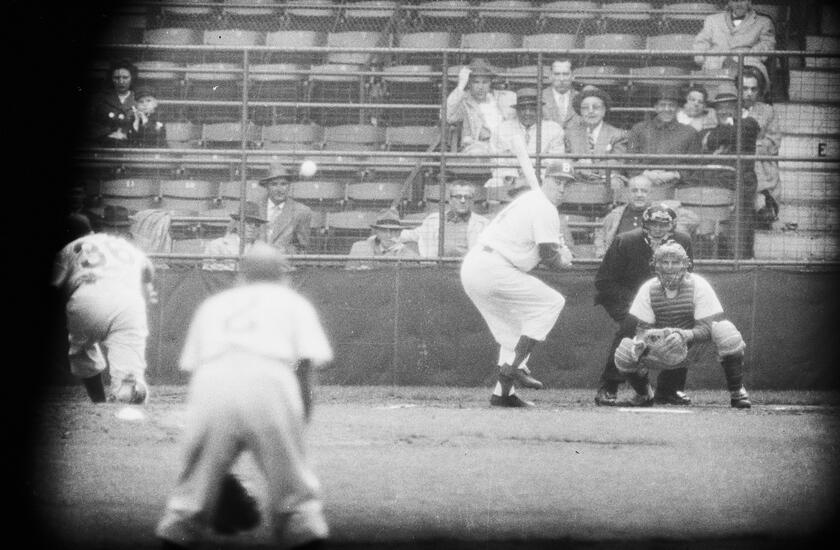 Photographs of Duke Snyder and other players for the Brooklyn Dodgers playing a baseball game in a mostly empty stadium.