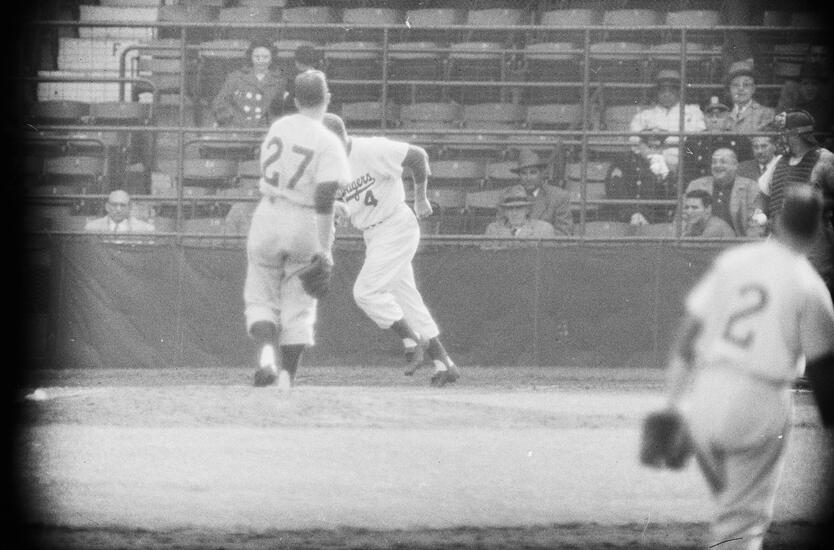 Photographs of Duke Snyder and other players for the Brooklyn Dodgers playing a baseball game in a mostly empty stadium.
