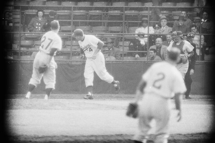 Photographs of Duke Snyder and other players for the Brooklyn Dodgers playing a baseball game in a mostly empty stadium.