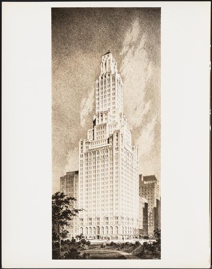 Barbizon Plaza Hotel. Exterior from Central Park over trees.