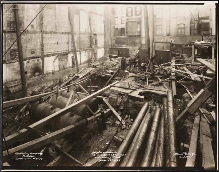 Ziegler residence. #2-4-6 East 63rd St. N.Y.C. Condition of foundation under bay window on N. wall of #5 East 62nd St. Loose [...] removed temporarily for safety-sake