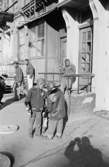 Photographs of residents of Harlem around the neighborhood. Depicts residents hanging out on stoops and shopping at local stores and markets, and children walking on the streets, climbing a chain-link fence, and playing games in empty lots and alleyways.