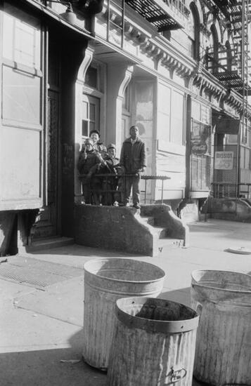 Photographs of residents of Harlem around the neighborhood. Depicts residents hanging out on stoops and shopping at local stores and markets, and children walking on the streets, climbing a chain-link fence, and playing games in empty lots and alleyways.