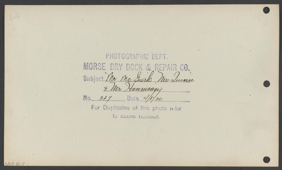 MORSE DRY DOCK & REPAIR CO. PHOTOGRAPHS [NEWLY ELECTED MEMBERS OF THE EMPLOYEES' ASSOCIATION, PRESIDENT - JOSEPH W. MCGUIRK, VICE-PRESIDENT - JOSEPH P. QUINN AND SECRETARY - EDWARD HANNIVAN.]