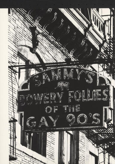 SIGN OF "SAMMY'S BOWERY FOLLIES," CLOSED IN 1973, 267 BOWERY. SIGN REMOVED. (NOVEMBER 1975)