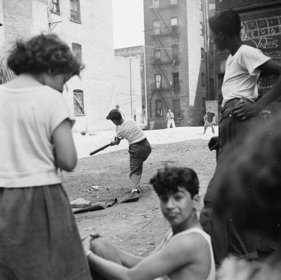 Photographs of Puerto Rican families in the city. Depicts children in an art class; a block party; a group of young men sitting on the sidewalk playing guitar; church services; people gathered for a wedding; children playing in fire hydrant water, streets, swimming pools, and alleys; grocers and street vendors selling food; and families in their homes. Also depicts a family de-boarding an airplane, waiting to collect their luggage, and getting in a taxicab at the airport.