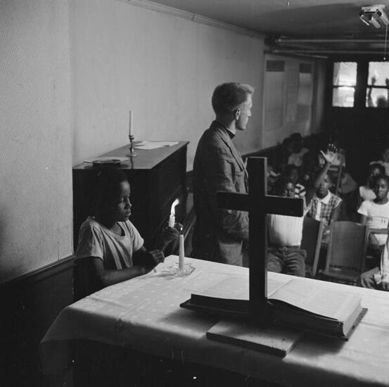Photographs of Puerto Rican families in the city. Depicts children in an art class; a block party; a group of young men sitting on the sidewalk playing guitar; church services; people gathered for a wedding; children playing in fire hydrant water, streets, swimming pools, and alleys; grocers and street vendors selling food; and families in their homes. Also depicts a family de-boarding an airplane, waiting to collect their luggage, and getting in a taxicab at the airport.