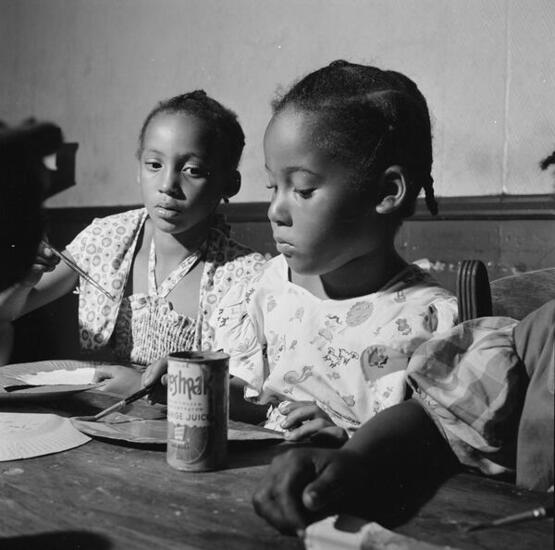 Photographs of Puerto Rican families in the city. Depicts children in an art class; a block party; a group of young men sitting on the sidewalk playing guitar; church services; people gathered for a wedding; children playing in fire hydrant water, streets, swimming pools, and alleys; grocers and street vendors selling food; and families in their homes. Also depicts a family de-boarding an airplane, waiting to collect their luggage, and getting in a taxicab at the airport.