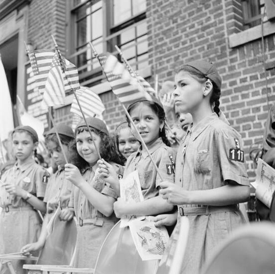 Photographs of Puerto Rican families in the city. Depicts children in an art class; a block party; a group of young men sitting on the sidewalk playing guitar; church services; people gathered for a wedding; children playing in fire hydrant water, streets, swimming pools, and alleys; grocers and street vendors selling food; and families in their homes. Also depicts a family de-boarding an airplane, waiting to collect their luggage, and getting in a taxicab at the airport.