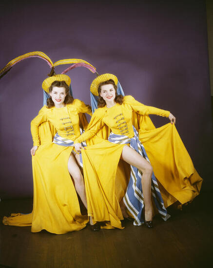 Photographs of female dancers and chorus girls modeling elaborate costumes designed by Miles White. They are a variety of bright colors and styles, and many feature matching hats or headpieces. Includes costumes for "Dream With Music."