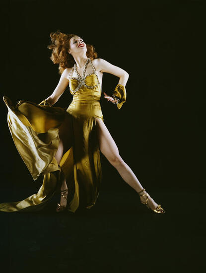 Photographs of female dancers and chorus girls modeling elaborate costumes designed by Miles White. They are a variety of bright colors and styles, and many feature matching hats or headpieces. Includes costumes for "Dream With Music."