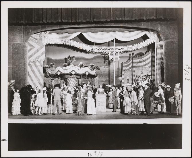 [Iva Withers as Julie Jordan with ensemble performing the "What's the Use of Wond'rin'?" number in "Carousel".]