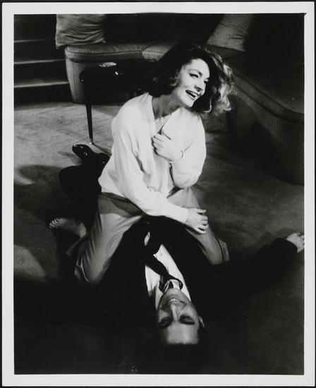 [Lauren Bacall as Stephanie and Barry Nelson as Julian in "Cactus Flower".]