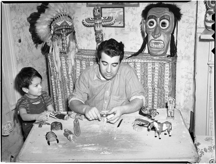 [Man making wooden toys as a boy watches.]