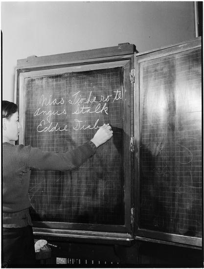 [Young man writing "Romany Gypsy" on a blackboard.]