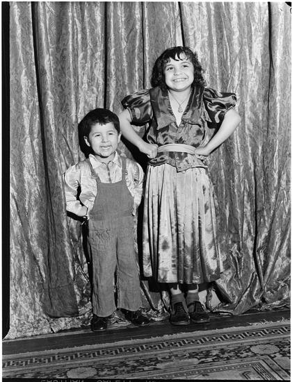 [Girl with man dressed as Santa Claus at a Christmas celebration.]