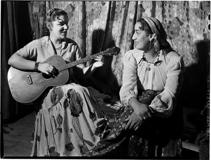 [Women showing a man and a woman cards while a man plays the accordion.]