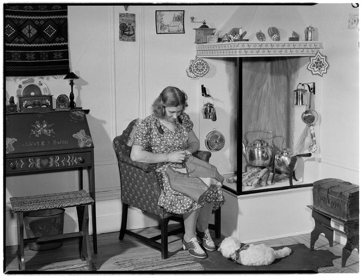 [Woman knitting in a living room.]