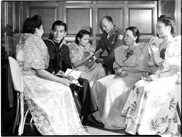 [Women showing a man and a woman cards while a man plays the accordion.]