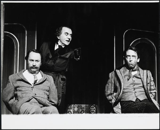 [ Fritz Weaver as Sherlock Holmes, Peter Sallis as Dr. Watson and Inga Swenson as Irene Adler in "Baker Street".]