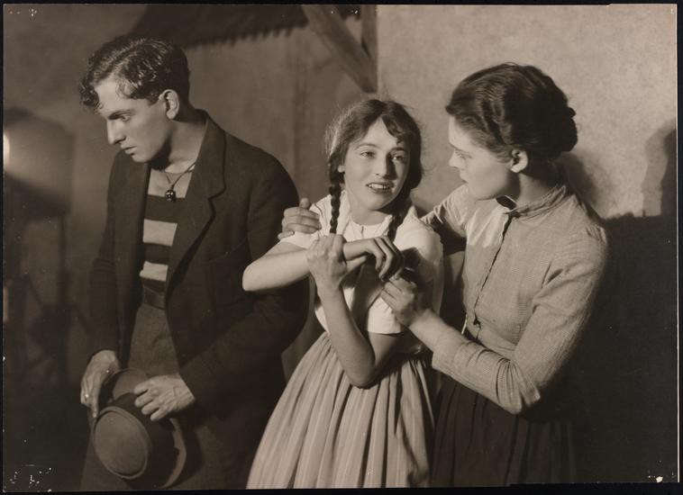 [Beatrice De Neergaard as Marie, Joseph Schildkraut in the title role and Eva Le Gallienne as Julie in "Liliom".]
