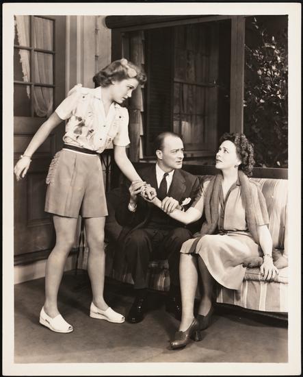 [Jessie Royce Landis as Janet Archer, Joan Caulfield as Corliss Archer and Robert Keith as Harry Archer in "Kiss and Tell".]