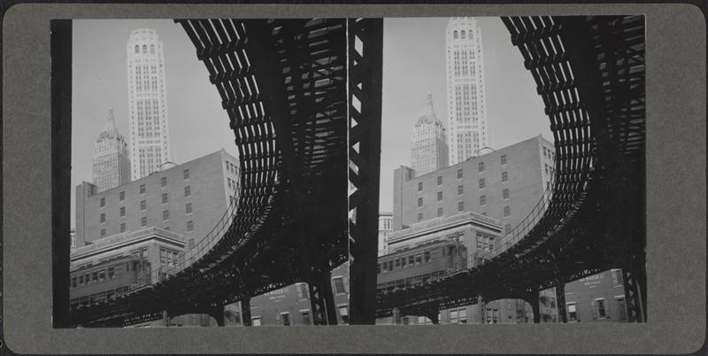 View looking up at skyscrapers from under 3rd Avenue El at Coenties Slip.