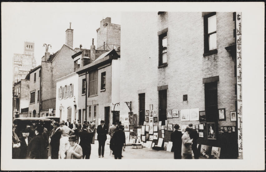 Macdougal Alley. Greenwich Village. Former stables, now artists studios. Tall building #1 Fifth Avenue. Apartment hotel.