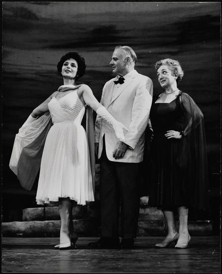 [Molly Picon as Clara Weiss, Robert Weede as Phil and Mimi Benzell as Ruth in "Milk and Honey".]