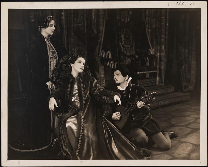 [Ernest Cossart as Lord Throgmorton, Helen Menken as Elizabeth Tudor and George Coulouris as Lord Burghley or Lord Erskine in "Mary of Scotland".]