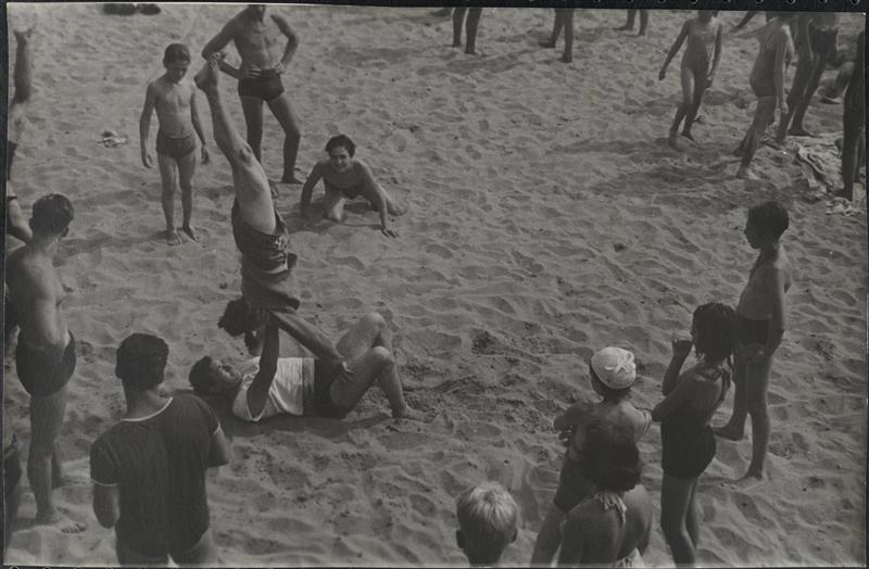 [Group of teenage boys performing stunt on Coney Island beach.]