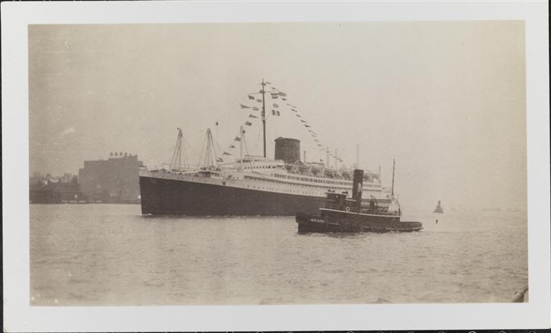 [Moran tugboat guiding RMS Aquitania to dock.]