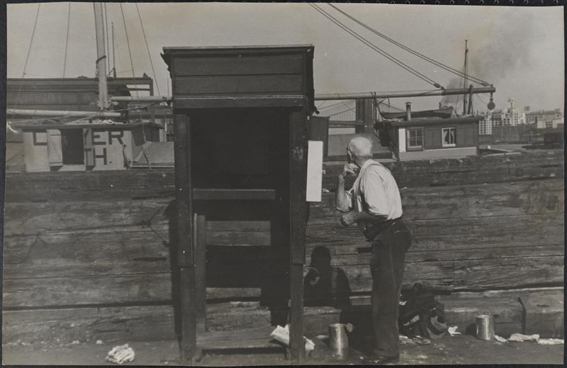 [Destitute man sleeping on East River pier with Brooklyn skyline visible.]