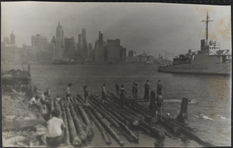 [Men hanging out on deck of ship with view of Manhattan skyline.]