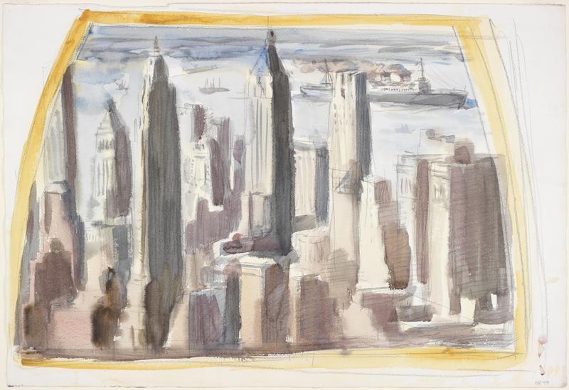 Lower N.Y. (looking north) with battle ship from "News" photo.
