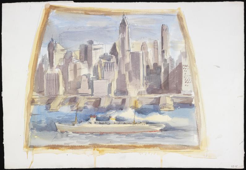 Naked boys swimming, Hoboken - Manhattan in distance.