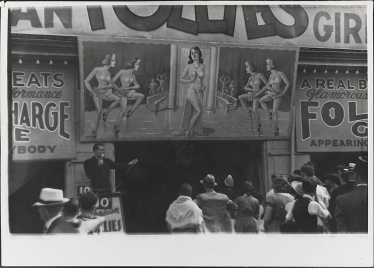 [Sign advertising Follies Girl Show in front of Stauch's building on the Coney Island Bowery.]