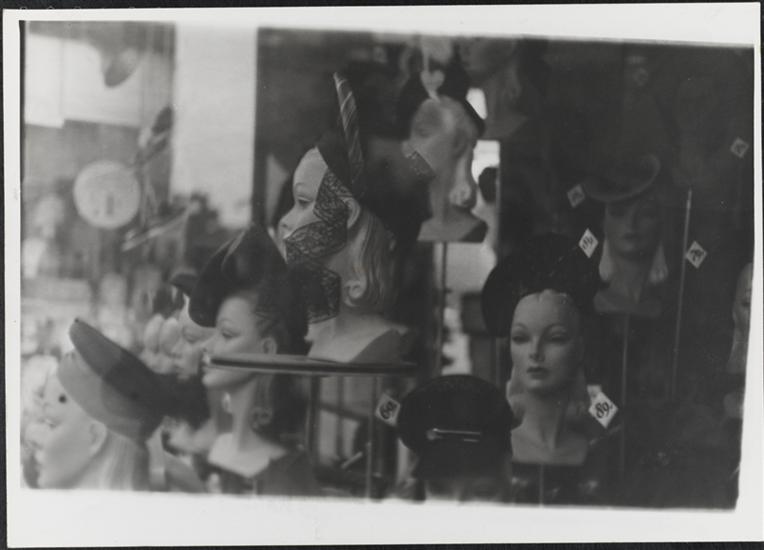 [Hat displays in store window and two women walking down city street.]