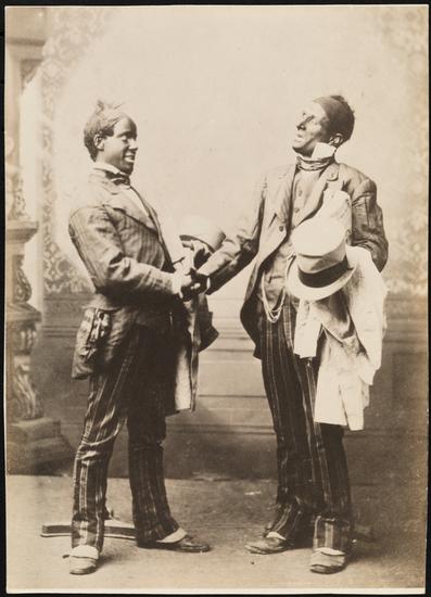 [Harrigan and Hart performing "The Little Fraud" sketch.]