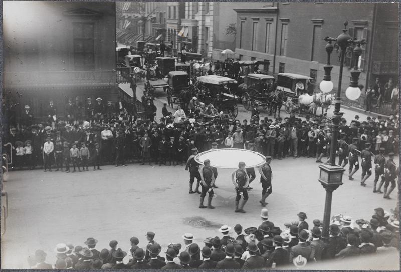 [A. Horse-drawn fire equipment in a parade ; B. Horse-drawn fire equipment in a parade.]