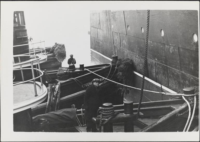 [Crew on deck of ship with tugboat close by.]