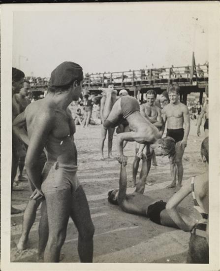 [Group of teenage boys performing stunt on Coney Island beach.]